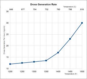 The diagram above illustrates how the molten metal temperature affects dross generation rates. At 790°C, the dross generation rate literally doubles as compared to 730°C. Conversely, if the furnace was operating at 800°C and the temperature was reduced to 730°C, the surface dross generation rate would be cut by 70%! By incorporating good circulation practices and reducing furnace temperatures, the dross generation rate can be significantly reduced. Consequently, you can reduce metal loss while reducing your carbon footprint.
